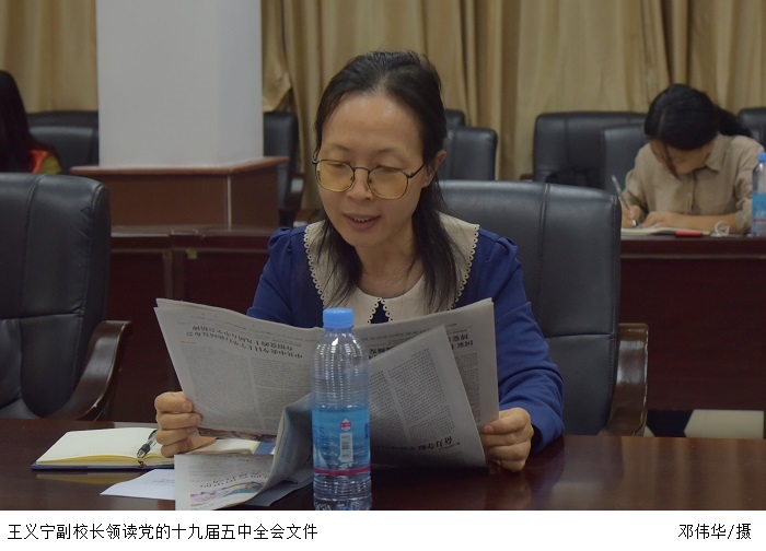 王义宁副校长领读了党的十九届五中全会文件。王副校长指出,习近平总书记的重要讲话审时度势、总揽全局,思想深邃、内涵丰富,具有很强的政治性、思想性、理论性、指导性。张湘伟校长强调,Beat365要深入学习领会习近平总书记重要讲话精神内涵,增强“四个意识”、坚定“四个自信”、做到“两个维护”,与以习近平同志为核心的党中央保持高度一致,发扬斗争精神,更加奋发有为,把党中央战略思想和决策部署贯彻到学校发展中去。