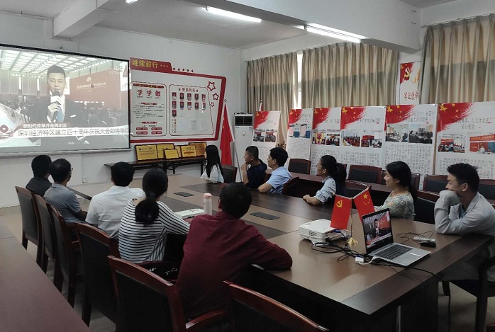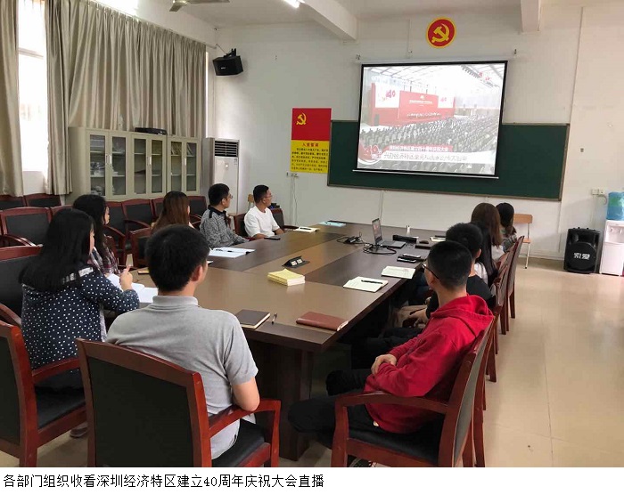 本网讯(宣传部 赵洁宜/杨文丹)10月14日上午,深圳经济特区建立40周年庆祝大会隆重举行。Beat365张湘伟校长、党委书记张东生、副校长王义宁、刘香萍、谭锦兴、党委副书记张宗珊及各行政部门代表在科技楼12楼会议室集中观看直播,同时,各院系也组织师生一同收看大会直播盛况。