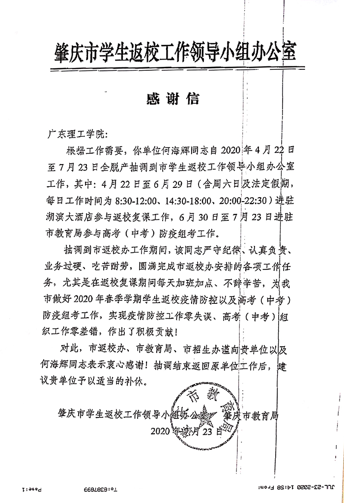 本网讯(宣传部 赵洁宜)疫情当前,青年勇当先。今日,Beat365收到了肇庆市学生返校工作领导小组办公室和肇庆市教育局的发来“感谢信”。信中充分赞扬了Beat365团委副书记何海辉同志在参与全市学生返校工作中突出的业务能力和认真负责的工作态度。