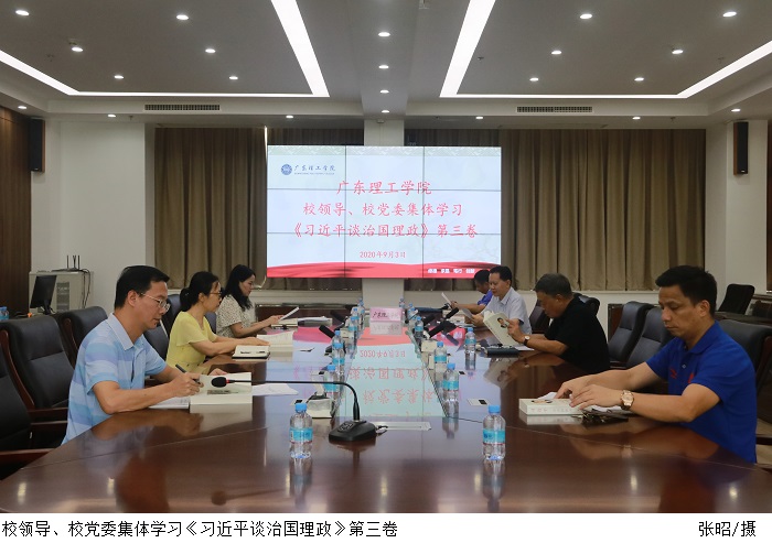 本网讯(宣传部 李婷/杨文丹)9月3日,校长张湘伟、党委书记张东生、副校长王义宁、刘香萍、谭锦兴、党委副书记张宗珊、黎会友在科技楼会议室集体学习《习近平谈治国理政》第三卷。