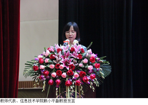 教师代表、信息技术学院赖小平副教授表达了对2019届同学的祝贺,她希望毕业生们在离开校园之后,要做到怀揣梦想生活,继续学习和脚踏实地,踏踏实实做事。