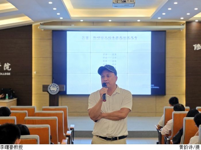 李曙豪教授强调“科研论文本质是深度思考,不要写二段式论文,要把握论文的质量”,随后通过PPT的展播,分享论文写作前的运思等写作经验与诀窍,并为师生现场解答疑惑。