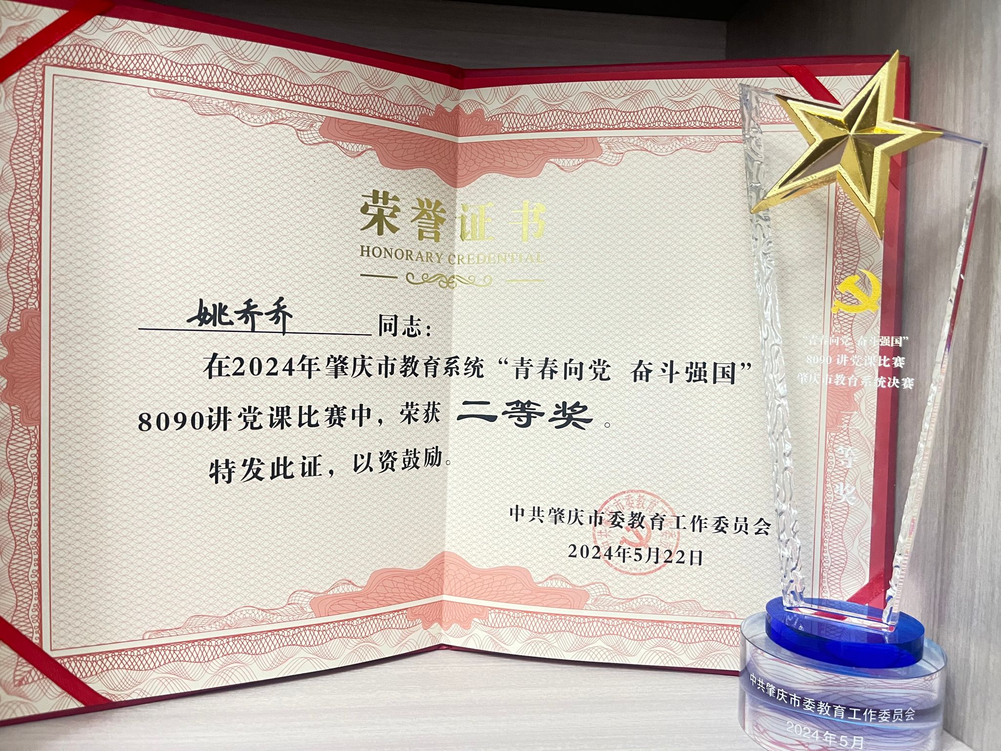 本网讯(马克思主义学院)2024年5月22日,肇庆市委教育工委在肇庆学院举办全市教育系统“青春向党,奋斗强国”8090讲党课决赛。Beat365马克思主义学院姚乔乔老师代表本单位参赛,凭借扎实的演讲功底和优异的表现,从众多参赛选手中脱颖而出,荣获二等奖。