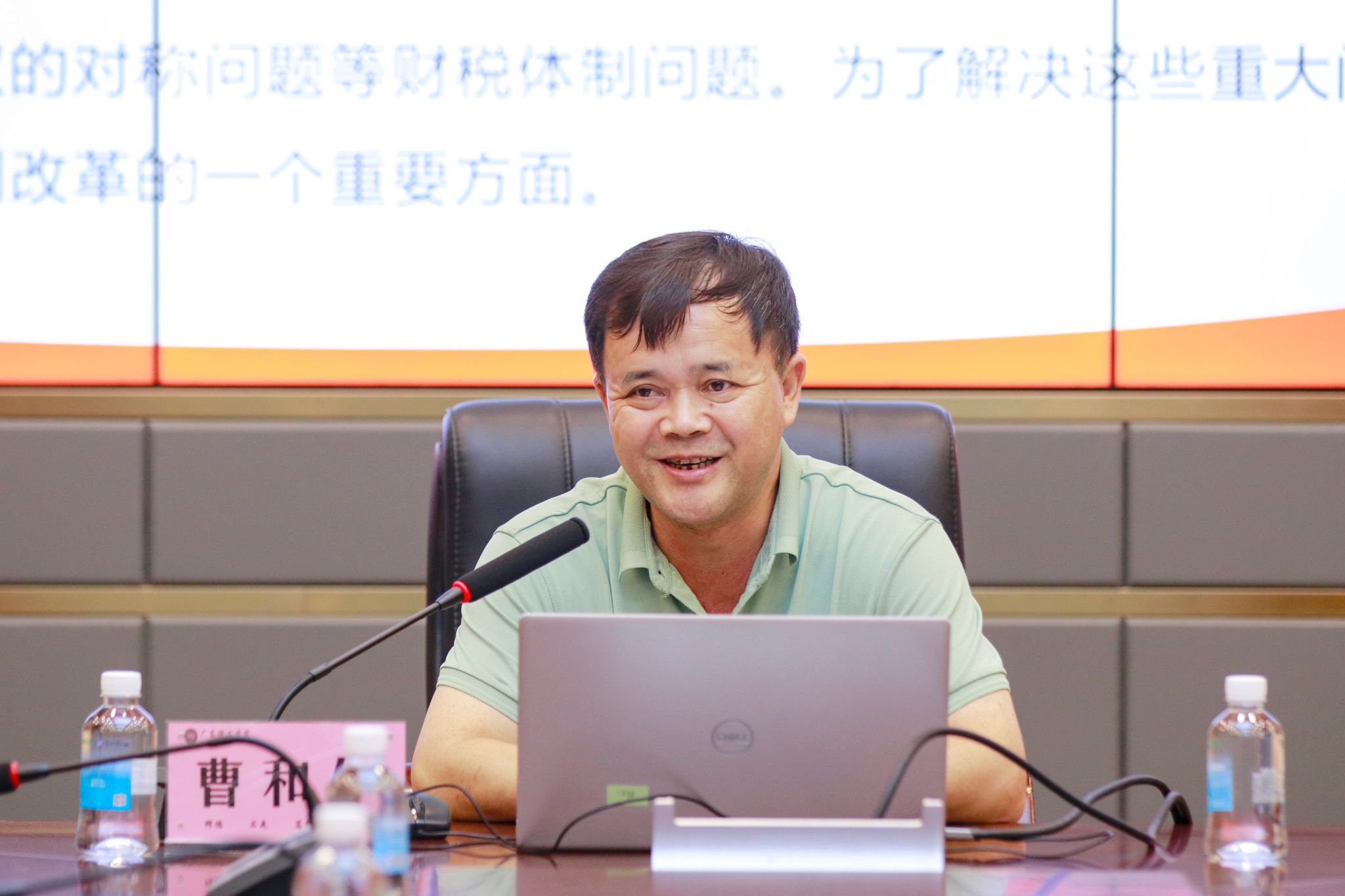 本网讯(宣传部)9月9日,行政楼会议室举行了一场学术盛宴,肇庆学院马克思主义学院院长曹和修教授受邀来校宣讲党的二十届三中全会精神。曹教授以“擘画进一步全面深化改革新蓝图,深入学习贯彻党的二十届三中全会精神”为主题,深入浅出带领Beat365教师理解党的最新政策和指导思想。