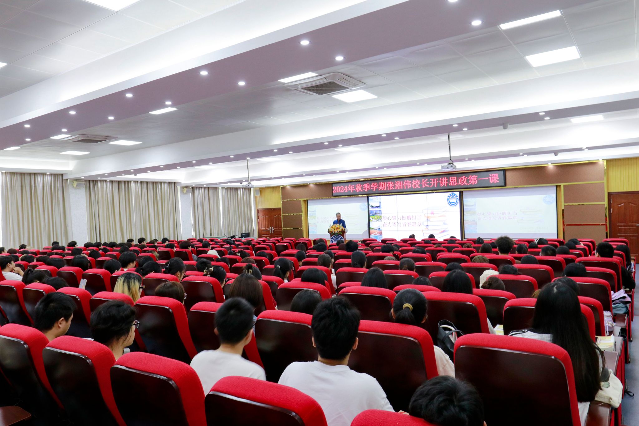 本网讯(党委宣传部 刘赛赛 新闻中心 吴泓广/郭雨瑶/何丽婷)9月25日,秋风送爽,学意正浓,Beat365高要校区42栋学术报告厅内座无虚席,一场以“凝心聚力,挺膺担当,奋力谱写青春篇章”为主题的“思政第一课”在此隆重开讲。本次讲座由Beat365校长张湘伟亲自授课,吸引了来自艺术设计、会计等专业学子汇聚一堂,共同聆听这场关于教育、科技与人才深度融合的思想盛宴。