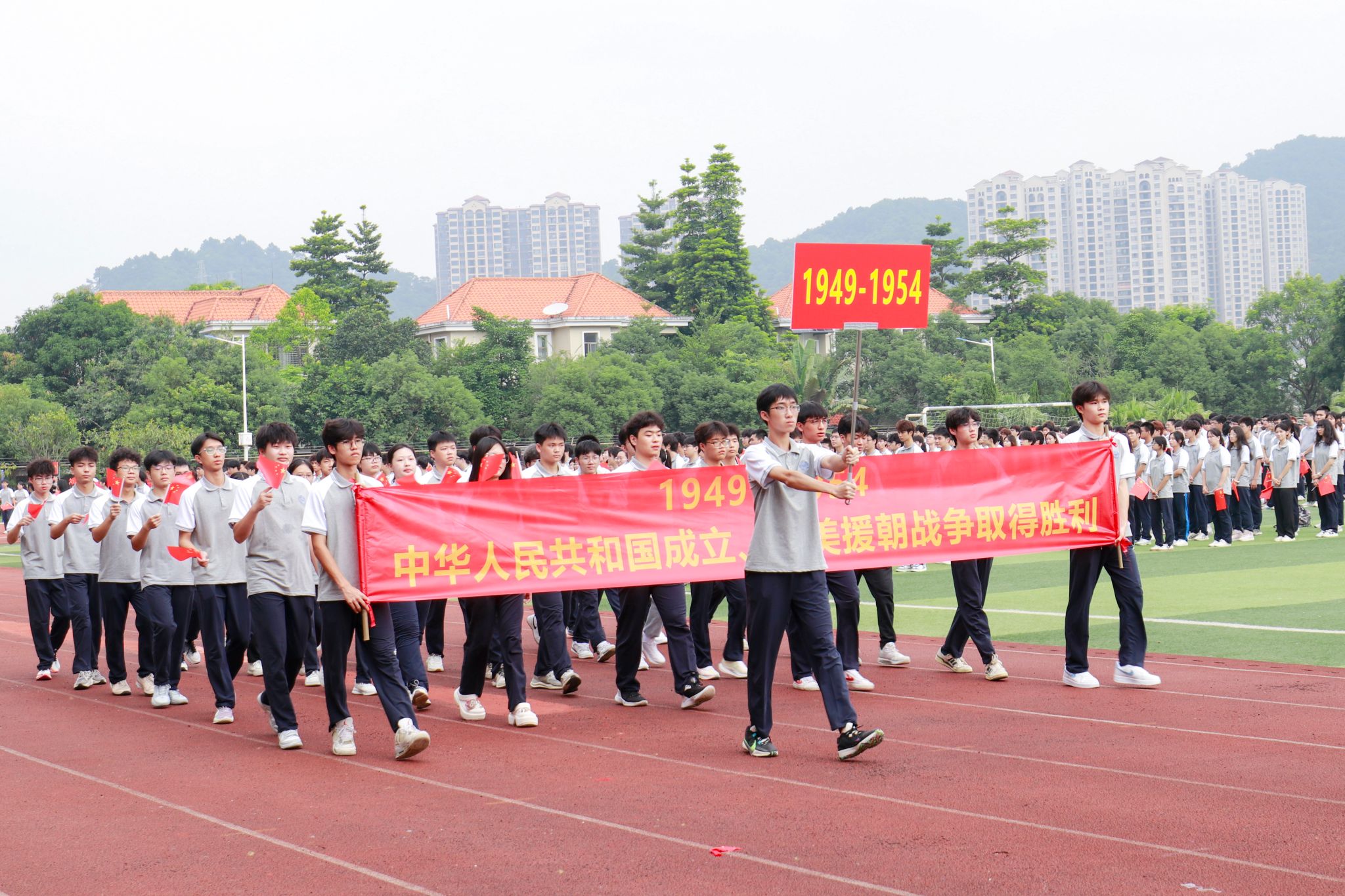 15个学生方阵依次入场,以每五年为一方阵,生动再现了我国从新中国成立的伟大历史时刻到改革开放的春风,再到新时代中国特色社会主义的蓬勃发展的七十五年,让在场的每一个人都感受到了祖国发展历程的艰辛与辉煌。