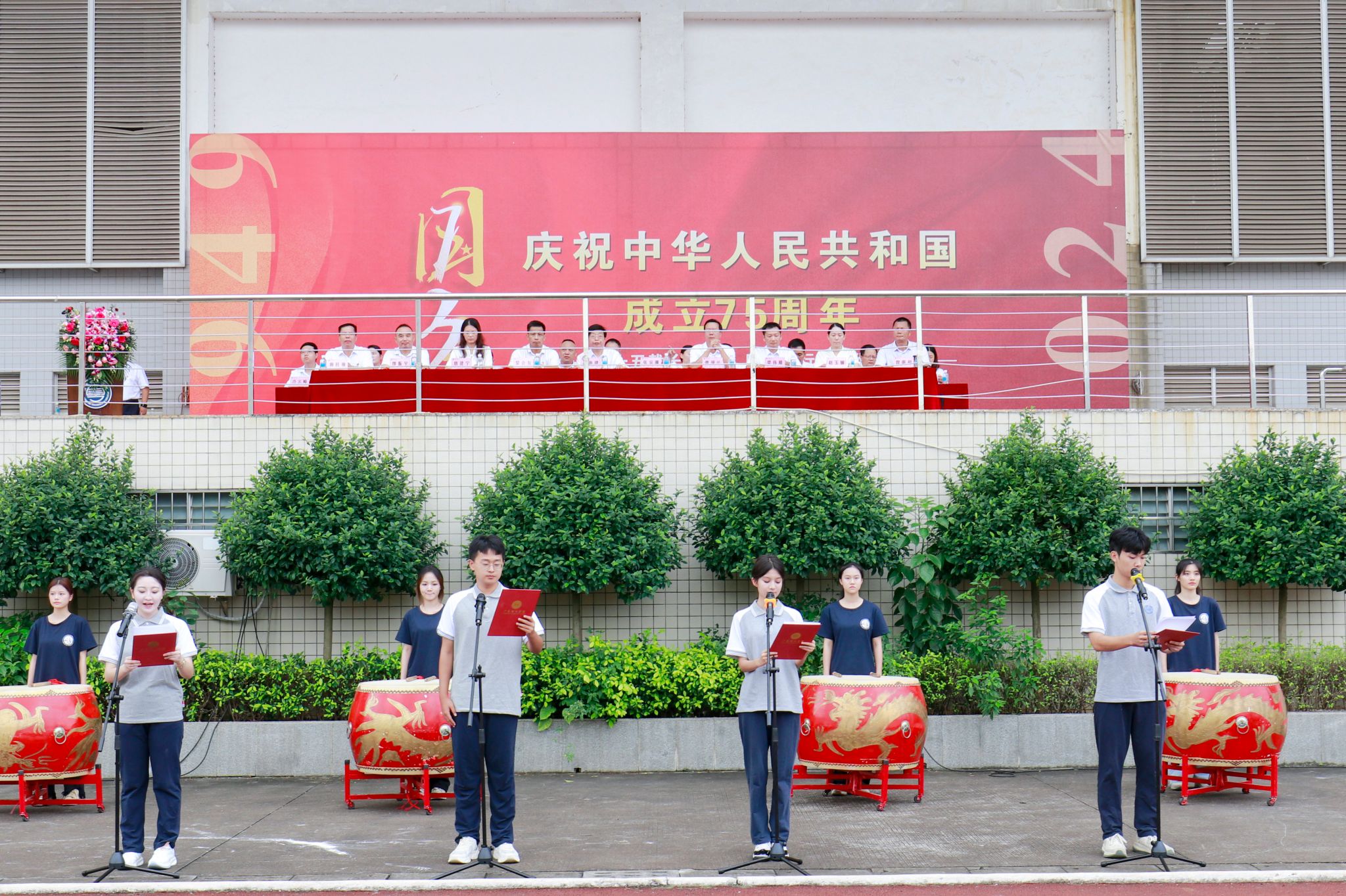 学生代表上台献词,用真挚的语言,表达对祖国的热爱和美好祝福。同时,全体师生共同高呼:“请党放心,强国有我!请祖国放心,强国有我!”这响亮的口号声回荡在运动场上空。