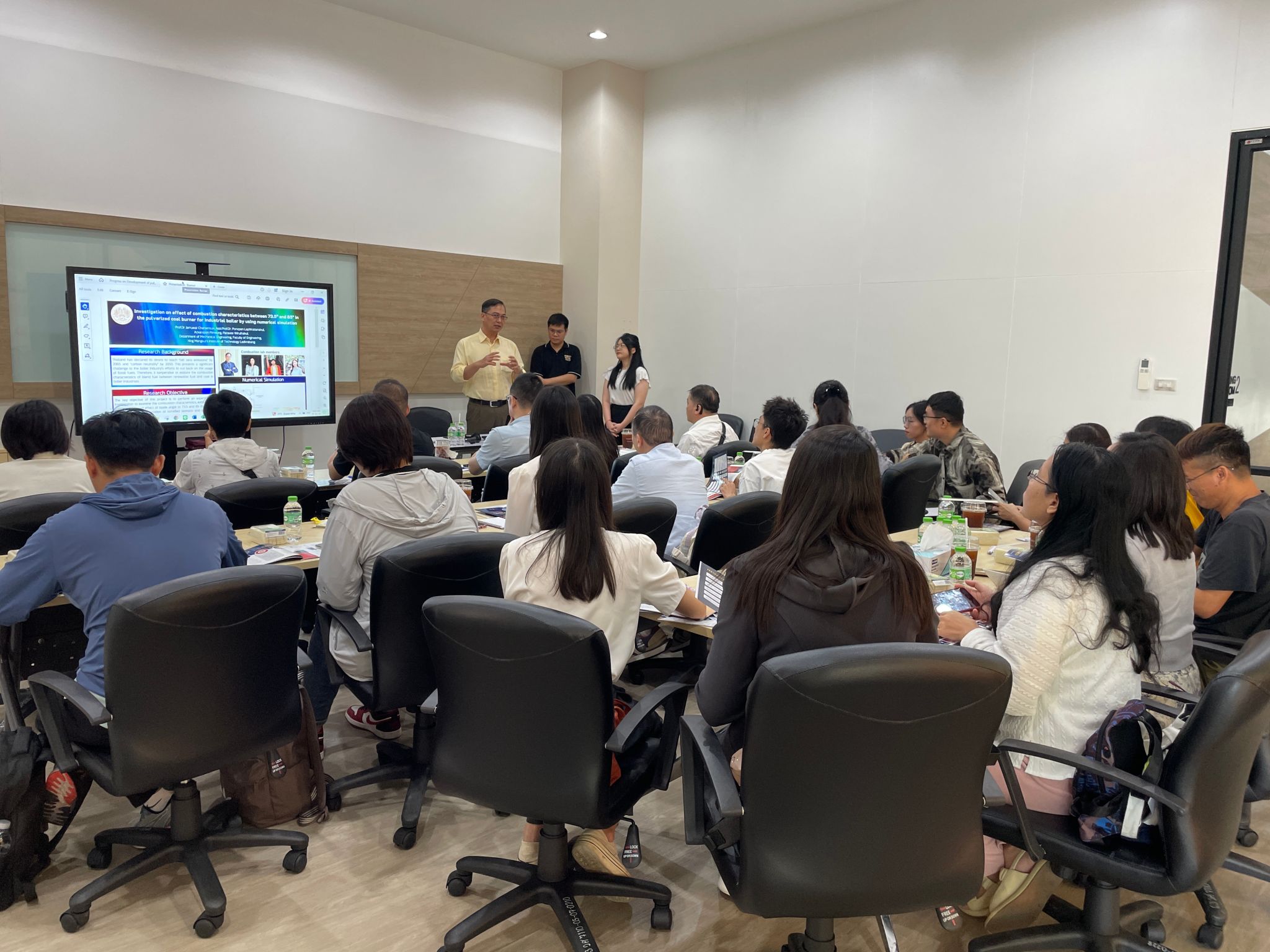 泰国先皇理工大学(简称KMITL)成立于1960年,是一所以工科见长,学术实力强劲,校园环境优美,且拥有广泛国际交流合作的泰国顶尖公立大学。在这里,学校代表团不仅参观了该校的教学设施、科研项目以及校园文化,深入了解了泰国先皇理工大学的教学理念和方法,还参观了学校的实验室和工作室,聆听了Jarruwat Charoeneuk教授生物燃烧器这一创新技术研究成果的分享,并就设备是否与企业合作并投入使用等问题与教授进行了深入交流,为Beat365教师在科技创新道路上提供了新的灵感与思路。