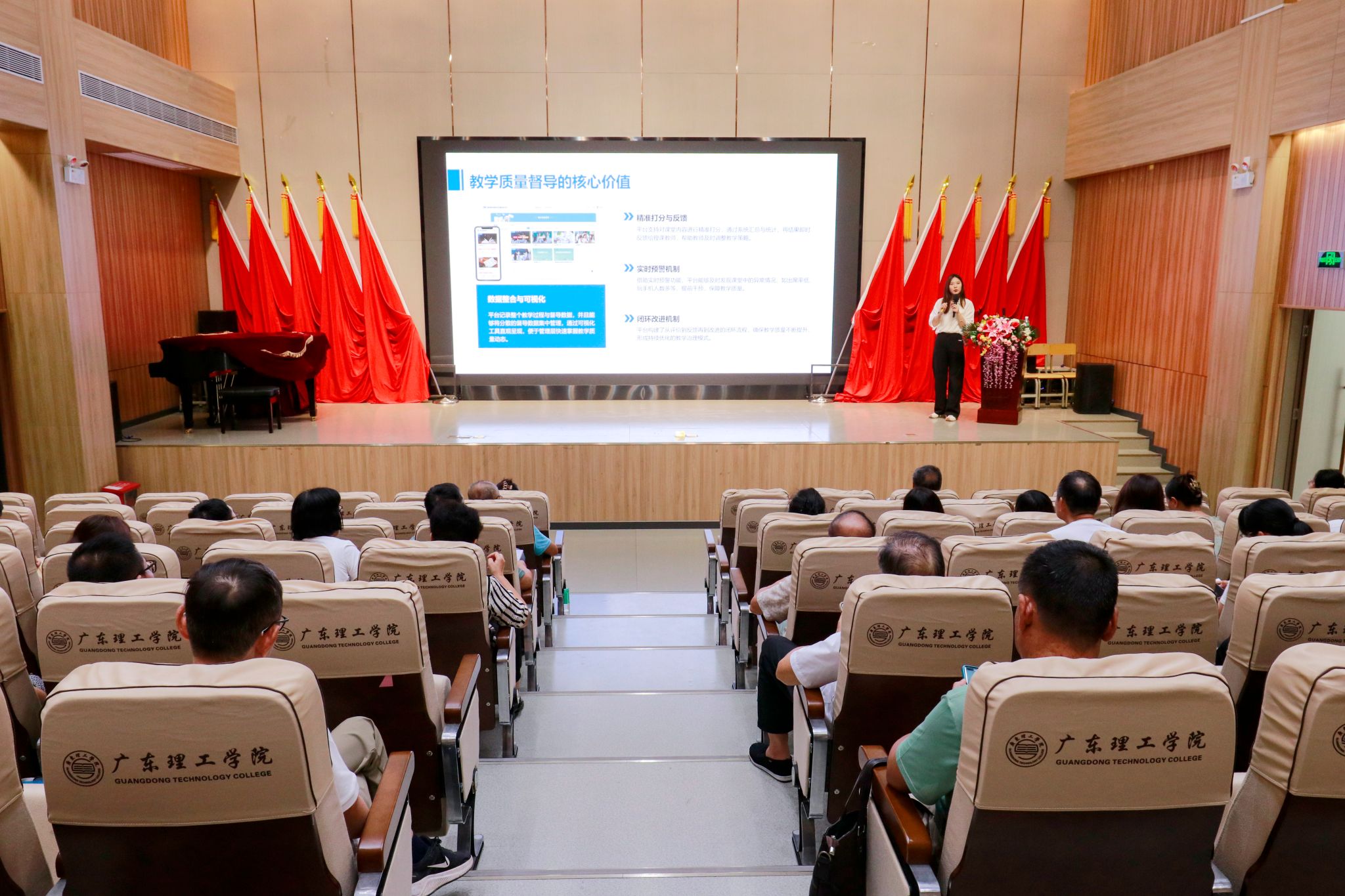 会议主要内容为教学督导室主任作督导工作报告、校领导讲话、奥威亚AI智慧督导巡课监控系统培训讲座。