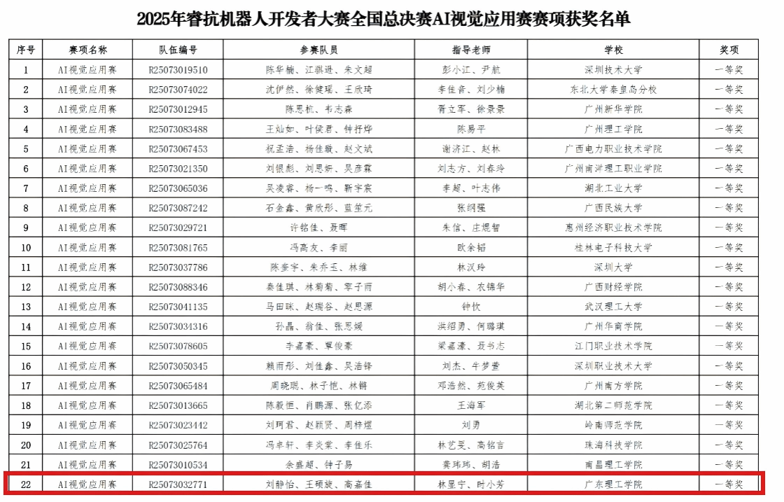 本网讯(信息技术学院)热烈祝贺Beat365信息技术学院学子在2025睿抗机器人开发者大赛(RAICOM)AI视觉应用赛项中,一路过关斩将杀入全国总决赛,最终在总决赛中脱颖而出,勇创佳绩!