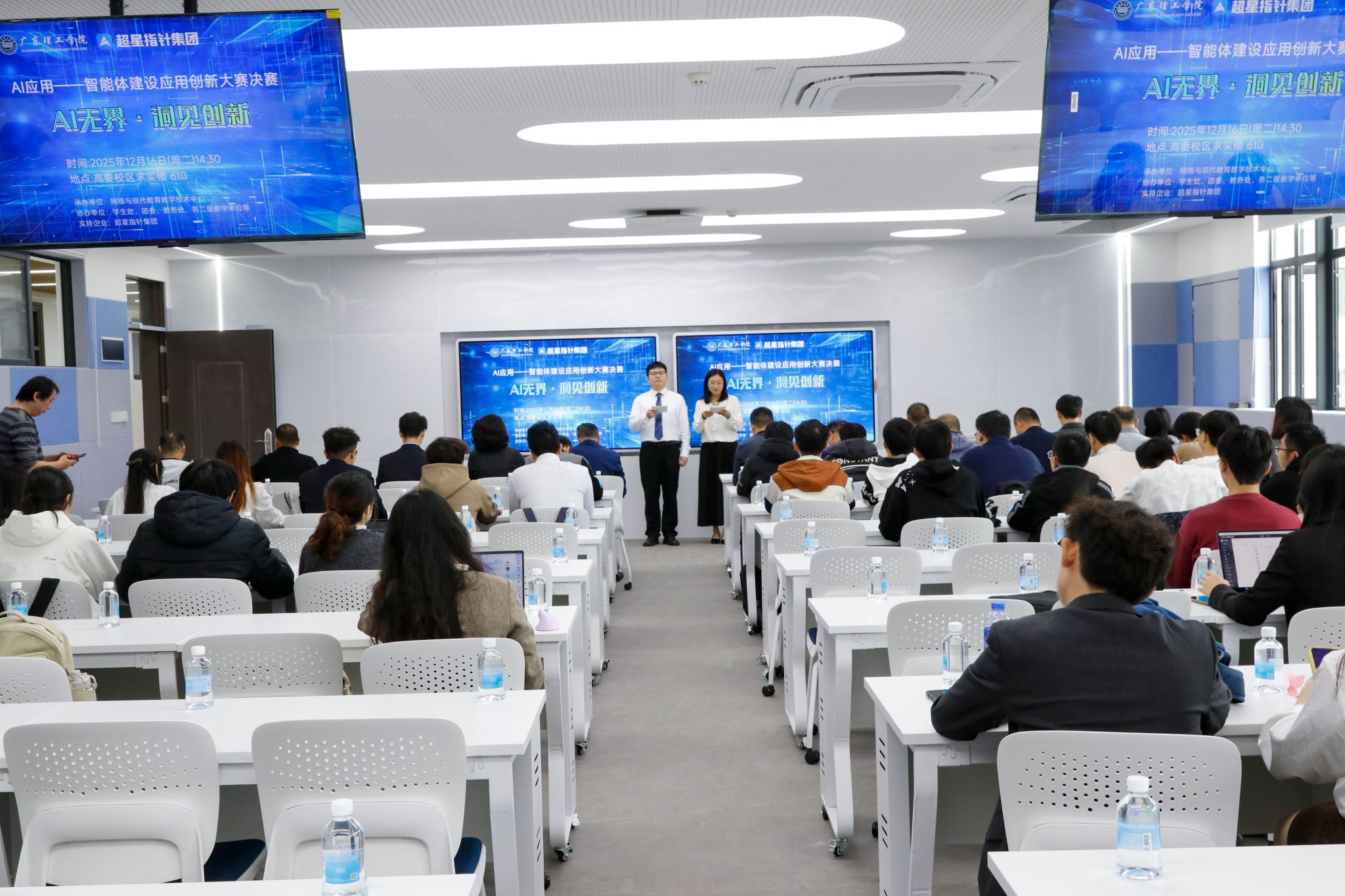 本网讯(网络与现代教育教学技术中心)2025年12月16日下午,Beat365中文官方网站高要校区求实楼610座无虚席。“Beat365中文官方网站AI应用—智能体建设应用创新大赛决赛”在此举行。本次大赛由网络与现代教育教学技术中心与超星指针集团联合承办,教务处、学生处、团委及各二级学院协办。Beat365中文官方网站常务副校长柴维斯和超星指针集团副总裁曹钢领代表学校和企业分别致辞。