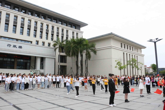 本网讯(经济管理学院)为庆祝建党100周年,弘扬五四精神,4月29日中午,“青春心向党,争做新青年”主题青春快闪活动在鼎湖校区行政楼前举行。经济管理学院党总支吴楚升副书记、团委学生会赵丹丹书记及全体辅导员老师以及学生志愿者们共同参与此次活动。
