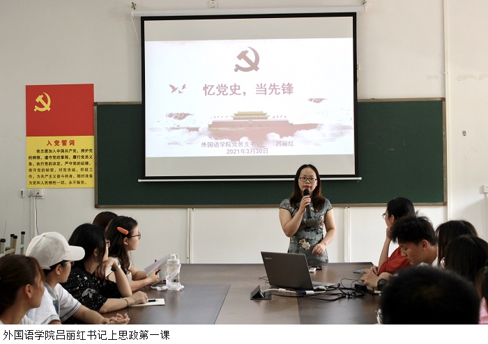 第二部分是:当先锋。吕丽红书记让同学们翻译了“庆祝中国共产党成立一百周年”,巧妙地引出作为外国语学院学生和积极分子,要利用专业所长服务社会。同时,吕丽红书记举了一系列例子,引导同学们在“传承、传播、传递”方面发扬外院学子风范,增强文化自信。