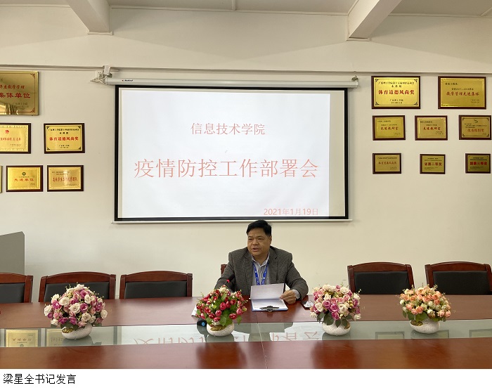 会上,梁书记传达学习了国家、省市和学校疫情防控相关文件精神,并对寒假期间疫情防控工作进行了部署,他强调,全院上下要始终绷紧疫情防控这根弦,落实落细学院疫情防控工作责任,做到守土有责、守土负责、守土尽责,各辅导员要做好学生寒假期间的去向统计,督促学生配合学校要求按时并如实进行粤康码上报工作。及时向学生及家长传达学校通知,落实教育及提醒义务,将《信息技术学院致家长的一封信》发送给家长查阅。全体教职工要保持手机畅通,及时关注工作群消息,严格执行“非必要不外出”的原则,居家做好个人防护,服从属地疫情防控管理。要通过官方途径密切关注疫情变化,科学抗击疫情,不信谣,不传谣。全学院要以更坚决的态度,更严实的举措,守好学院疫情防控工作阵地,为信息技术学院顺利开展2021年各项工作营造良好的环境。