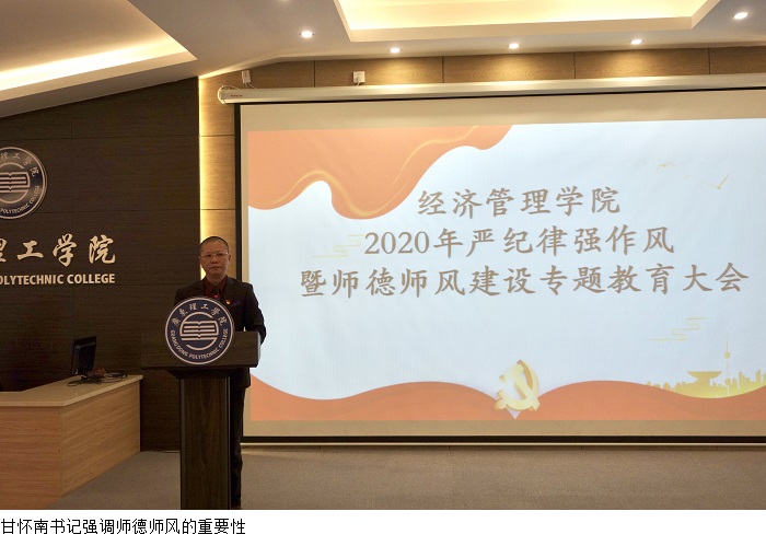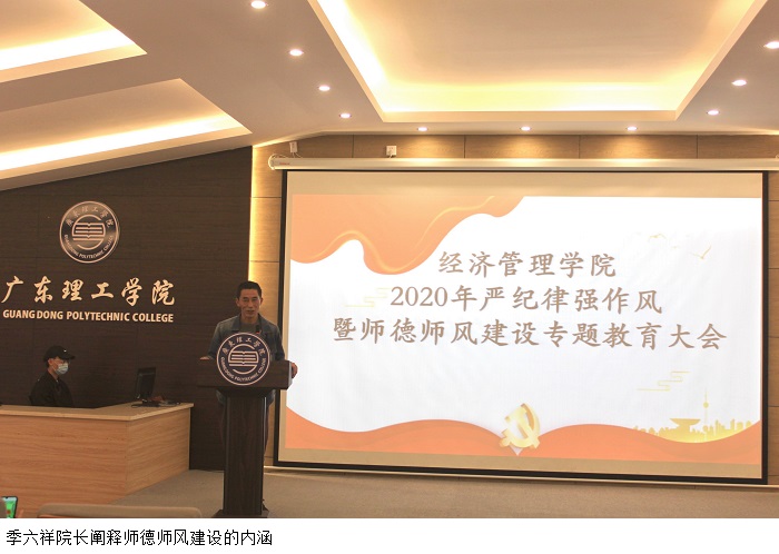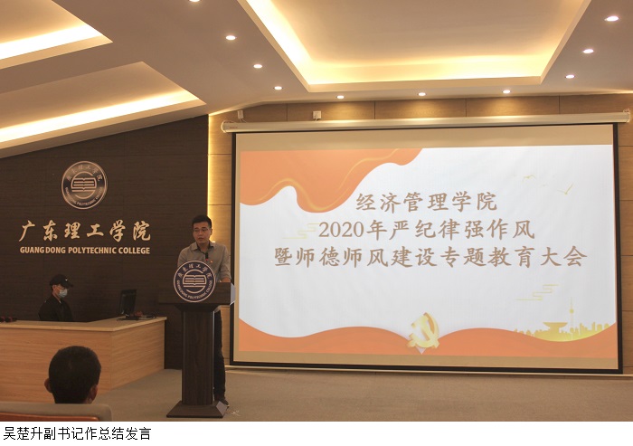 本网讯(经济管理学院)根据《Beat365中文官方网站党委关于加强Beat365党的政治建设贯彻落实< 民办高校党建工作重点任务>的决定》(广东理工党【2020】11号)的文件精神,为进一步强化党纪教育和师德师风建设,12月29日下午,Beat365于行政楼学术报告厅召开“2020年严纪律强作风暨师德师风建设专题教育”大会。季六祥院长、党总支甘怀南书记、魏嫚副院长、陈东旭副院长、办公室李佳妍主任出席大会,经管学院全体教职工参会,党总支吴楚升副书记主持。