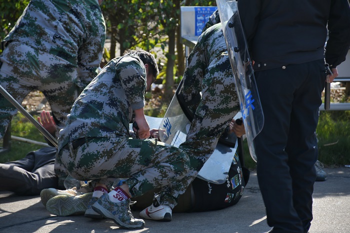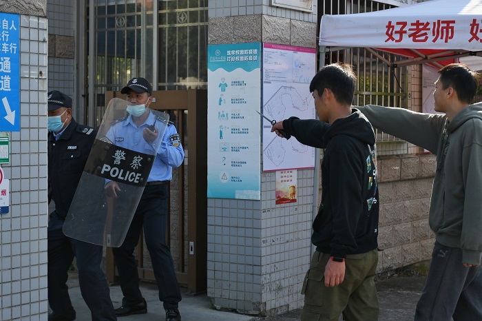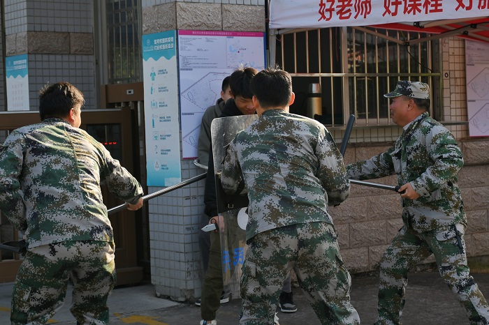 本次演练分为三组:“歹徒”扮演者、安保人员和机动组。演练现场模拟了两名歹徒试图闯入校园的情景,值班室安保人员手持盾牌、钢叉等安保器材,及时进行阻拦,集结校警赶赴现场并与歹徒周旋,最终联手制服歹徒,并将歹徒移交莲塘派出所。在整个演练过程中,安保人员反应迅速,处置措施得当。