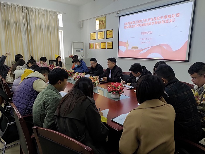 本网讯(信息技术学院 林淑卿/李雅靖)1月5日早上,信息技术学院于振华楼203室开展《教育部等五部门关于完善安全事故处理机制,维护学校教育教学秩序的意见》专题学习会,参与此次学习会人员有信息技术学院党总支梁星全书记、冷云峰副书记以及全体辅导员。