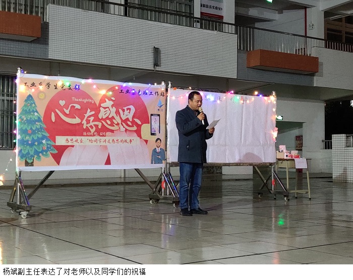 活动分别由工业系杨斌副主任以及李艳芳老师致辞,他们表达了对老师以及同学们的祝福,阐述了感恩的重要意义。活动中工业系学生党支部、易班干部为老师献上《感恩的心》手语、与老师门共同合唱《明天会更好》、学生代表上台发言、并且对此次“感恩周”乐于助人的同学进行表彰、派发礼品以及汤圆,最后组织老师同学们进行小游戏互动。