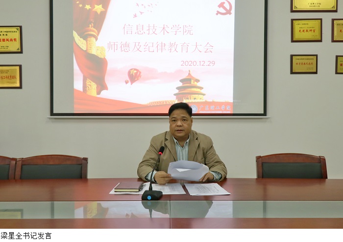 本网讯(信息技术学院 贺思琪)为提高Beat365教师师德水平及纪律观念,根据学校党委工作部署,12月29日下午,信息技术学院于振华楼203室开展师德及纪律教育大会。会议由信息技术学院党总支梁星全书记主持,学院全体教职工参加了会议。
