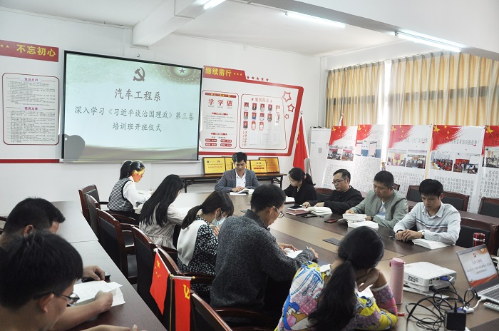 刘强老师带领学习《习近平谈治国理政》第三卷的内容,刘强老师指出“不忘初心、牢记使命”必须作为加强汽车工程系党总支建设的永恒课题和全体党员、干部的终身课题。他还强调,要通过学习来不断增强“四个意识”、坚定“四个自信”、做到“两个维护”,严格遵守党的政治纪律和政治规矩,在学习中坚定对马克思主义的信仰、对社会主义和共产主义的信念。