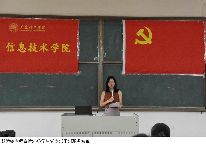 会场内响起庄严、神圣的国歌,全体起立、目光坚定。19级副负责人曹晖上台作本年度工作总结,接着为19级干部及干事颁发聘书和优秀工作者证书。胡娇铃老师上台宣读了20级学生党支部干部职务名单,随后20级副负责人张雨欣上台发表工作展望。