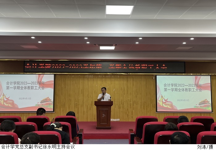本网讯(会计学院 黄琳琳)9月13日,会计学院在高要校区42101召开以“迎接合格评估,树立师德师风”为主题的2022-2023学年第一学期全体教职工大会,院长盛洁、党总支书记黎伯毅、副院长赵燕、副院长郑春晓、党总支副书记徐永明和全院教职工参加会议。徐永明副书记主持会议。