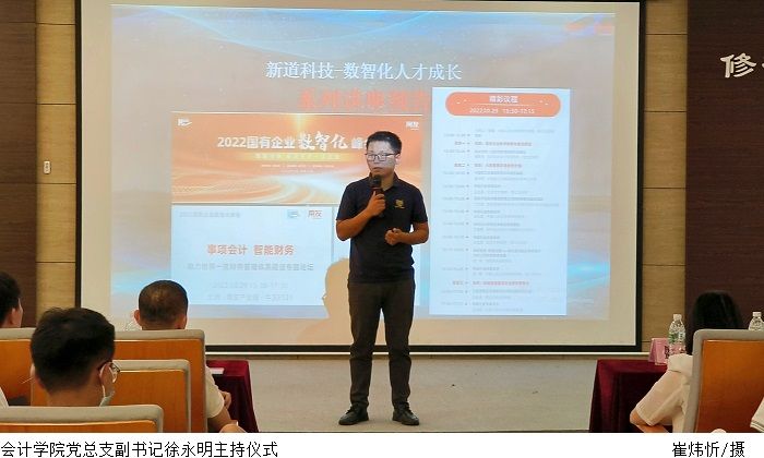 最后,新道科技服务总监黄才龙以“成为数智化人才”为题进行了专题演讲。他介绍了从行业发展历程,到企业数字化转型的趋势,并结合当前财务领域的变革现状,对未来数智化财务人才应该具备的素质和技能进行了细致讲解。