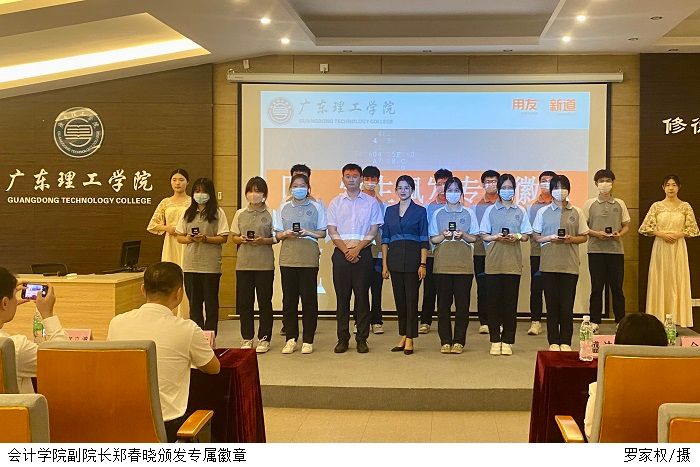 随后,双方为2022级创新班新生代表佩戴了产业学院专属徽章。这枚小小的徽章,象征着学校与新道科技对各位同学的无限期许,希望同学们在大学四年的学习生活中,积极向上、努力拼搏、永不言弃。