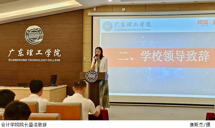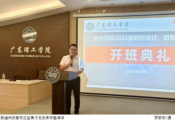 新道科技广东分公司总经理黄堪敬对学校和企业共建的数智会计产业学院模式进行了详细解读,强调为适应企业数字化转型的变革,产业学院将践行“把数智商业融入校园”,将新技术、新课程、新理念构建成新的教学体系,对接产业需求,培养行业紧缺人才。