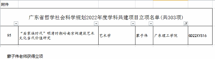 本网讯(科技处 刘霞)近日,广东省哲学社会科学规划领导小组办公室发布了广东省哲学社会科学规划2022年度学科共建项目立项名单,2022年度全省共立项303项,Beat365蒙子伟老师申报的《“后家族时代”明清时期岭南宗祠建筑艺术文化当代价值研究》项目成功立项,单项项目获得资助经费4万元。