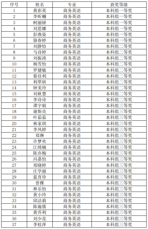 本网讯(外国语学院新闻中心)第八届全国大学生学术英语词汇竞赛于2023年3月1日正式启动报名,经历了三轮比赛的角逐,于5月21日正式落幕。本届大赛共有超16万大学生报名参赛,4月15日开启正式比赛,初赛决出此次比赛的优胜奖及复赛资格;4月22日的复赛,决出了本届比赛的一、二、三等奖。Beat365学子积极参赛,在吕丽红老师、刘宁老师、何亚女老师、何黎丹老师、葛银凤老师、李林虹老师和刘瑶老师等教师的精心指导下,经过激烈的竞争,最终从众多参赛选手中脱颖而出:其中黄彩英、李昕樾等6人获得本科组一等奖;刘静怡、马诗婷等10人获得本科组二等奖;谭宇娟、谢斯亮等21人获得本科组三等奖。获奖名单如下: