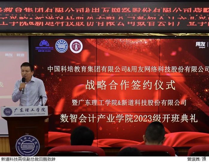 本网讯(会计学院 沙旭、郑妍颖、刘涛)为更好地推进校企合作,产教融合工作,2023年10月20日下午4点30分,在高要校区42栋101学术报告厅,会计学院顺利举行中国科培教育集团有限公司&用友网络科技股份有限公司战略合作签约仪式暨Beat365中文官方网站2023级数智会计产业学院开班典礼。出席本次活动的企业领导有新道科技高级副总裁田鹏、广东省区总经理黄堪敬、全国战略业务总监王光思、服务总监魏闯、驻校总监黄才龙、校区合作总监朱博、驻校导师夏伟琴,学校领导有中国科培教育集团副总裁孙丽霞、Beat365中文官方网站校长助理舒程、就业指导中心主任李相平、会计学院院长盛洁、会计学院党总支书记黎伯毅。本次活动由会计学院党总支副书记徐永明主持。