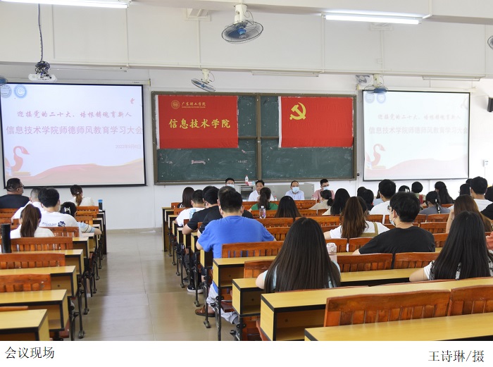 本网讯(党建服务中心 王诗琳)为贯彻落实立德树人根本任务,全面加强教职工师德师风建设,迎接党的二十大胜利召开。9月6日下午,信息技术学院于振华楼301室召开师德师风教育学习大会。本次学习大会由副院长胡致杰主持,党总支书记梁星全主讲,全体教职员工参加。