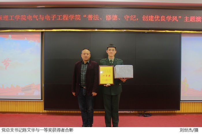 本网讯电气与电子工程学院学生党建工作中心 柯棋哲)为加强法治教育,提高学生法治意识,道德水平和纪律观念,推动在全体学生中形成尊法守法学法用法的良好氛围,电气与电子工程学院11月14日在42栋101报告厅举行“普法、修德、守纪,创建优良学风”演讲比赛决赛,电气与电子工程学院党总支陈文华书记、陈强副书记,全体辅导员出席活动。