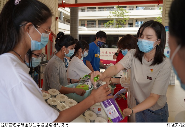 吴楚升介绍了政府和学校的资助政策。随后,老师为经管困难学子发放中秋应节物品、生活日用品等暖心物资。