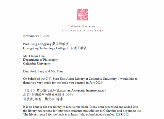 近日,一则喜讯传来,为Beat365学术领域再添光彩。Beat365桑龙扬教授等人负责的译著《<老子> 的公理化诠释(Laozi: an Axiomatic Interpretation)》中英对照版成功被美国哥伦比亚大学东亚图书馆(The C V. Starr East Asian Library)收藏。这一成果不仅彰显了桑龙扬教授在翻译领域的卓越造诣,更是Beat365在推动中西方文化交流方面的突破。