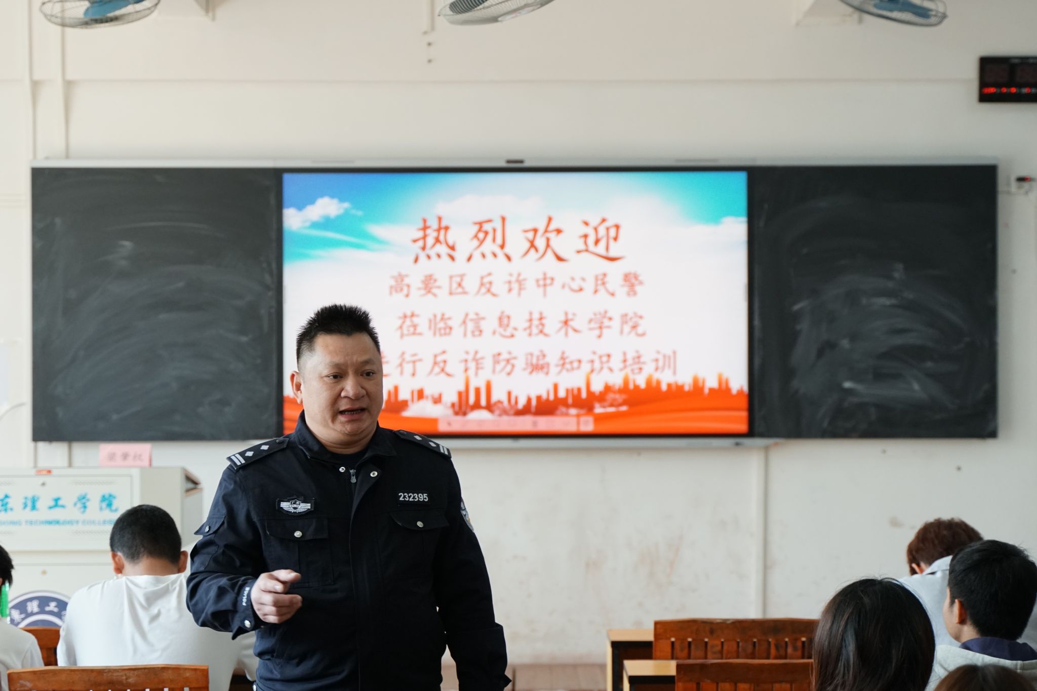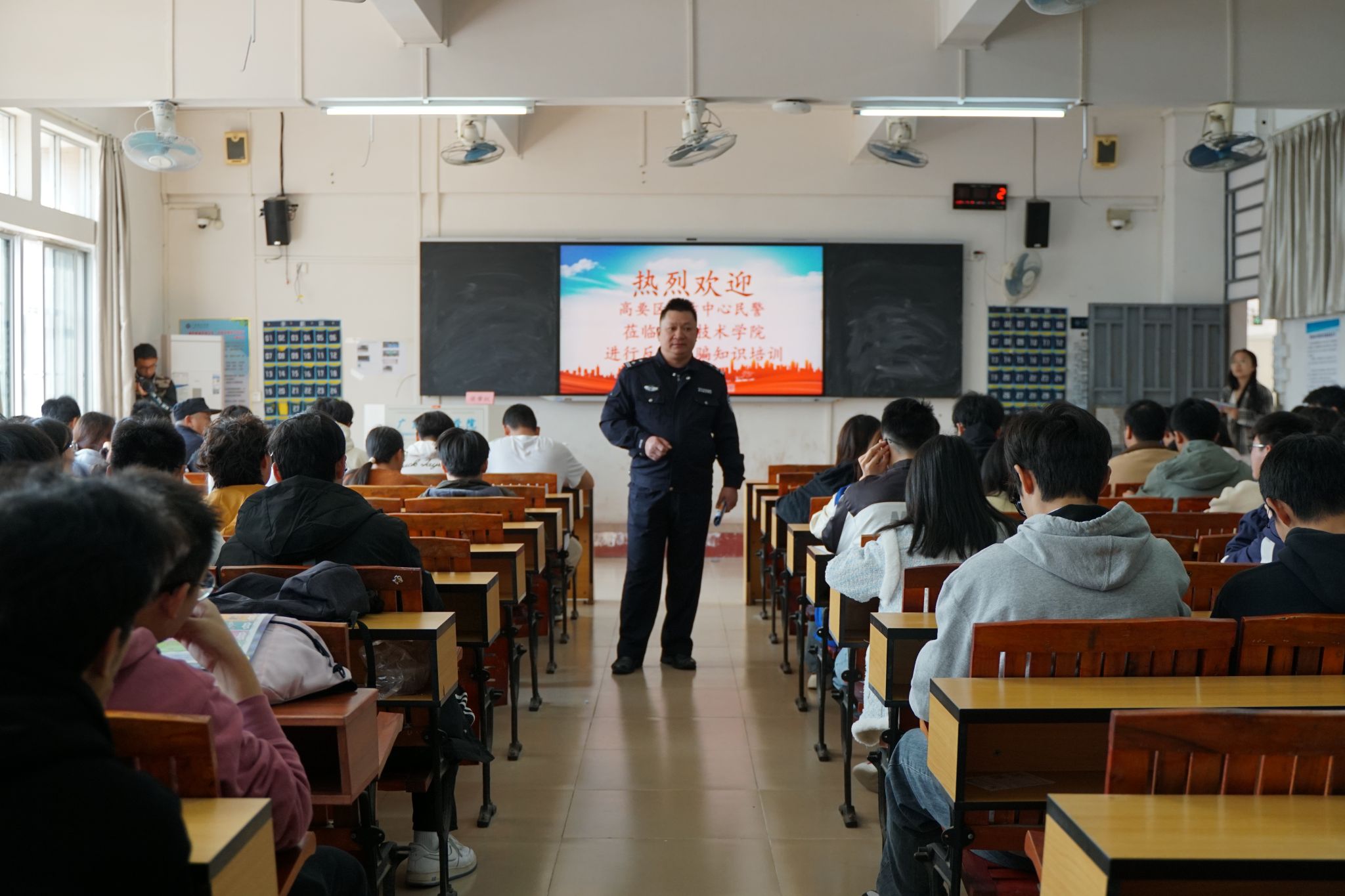 辅导员培训会议结束后,梁警官开始对信息技术学院学生进行培训。张若玉老师首先向同学们介绍了莅临本次活动的民警梁肇权,并强调反诈教育的重要性,她希望全体学生以本次培训为契机,将反诈意识融入专业学习与职业发展。