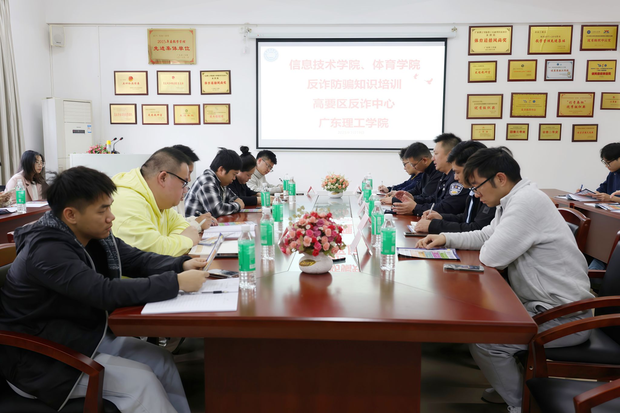 本网讯 为进一步强化新学期学生和教师的安全防范意识,提升应对电信网络诈骗的能力,扎实筑牢校园反诈坚固防线,2025年3月19日下午,信息技术学院、体育学院于振华楼203会议室开展反诈防骗知识培训。本次会议由信息技术学院党总支书记钟兆天主持,高要区反诈中心民警梁肇全、体育学院党总支书记夏磊、副书记李江华、学生处学生管理科詹庆文老师、信息技术学院和体育学院全体辅导员参加。