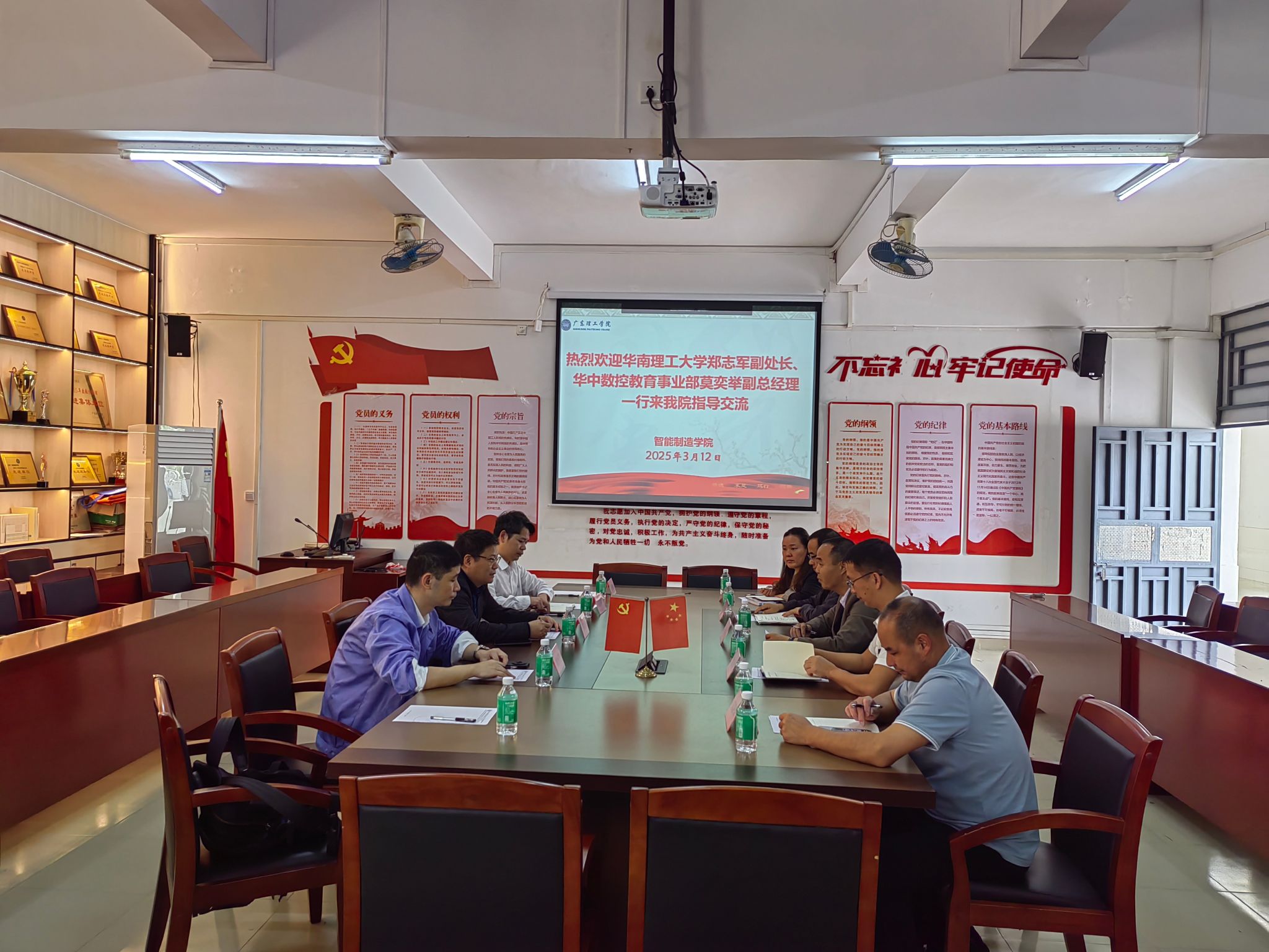 本网讯 3月12日上午10时,全国三维数字化创新设计大赛“华中数控杯”工业协作机器人及数字孪生技术创新应用专项赛(粤港澳大湾区赛区)合作交流会在Beat365中文官方网站9栋304会议室举行。Beat365中文官方网站智能制造学院院长杨斌、党总支书记彭清林、副院长黎志勇、庞小兰及党总支副书记苏庚华出席会议。华南理工大学设备处副处长、粤港澳大湾区大赛组委会主任郑志军,武汉华中数控教育事业部副总经理莫奕举、部长刘小平、区域经理龙国钦等嘉宾参与交流。