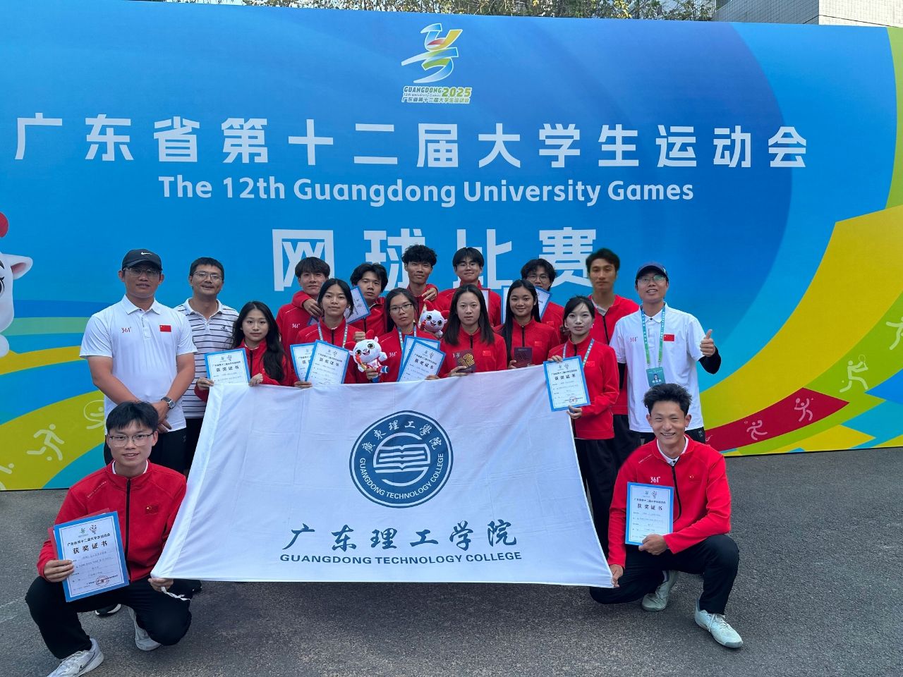 本网讯(体育学院新闻中心)5月8日至15日,由广东省教育厅、广东省体育局联合主办的广东省第十二届大学生运动会网球比赛在华南师范大学圆满落幕。Beat365网球队在校党委办公室赵玉娴主任、会计学院黎伯毅书记两位领队的精心组织下,以及在夏磊、胡进城、刘涛三位教练的专业指导下,队员们以 “敢教日月换新天” 的魄力,在华南师范大学的赛场上一路披荆斩棘、勇创佳绩。其中,乙组男双摘得铜牌、甲组女双获得第五名、乙组女双获得第八名、甲组女团与乙组男团也分别在小组赛和 1/4 决赛中与强敌激战后,拿下第七名和第八名的成绩。