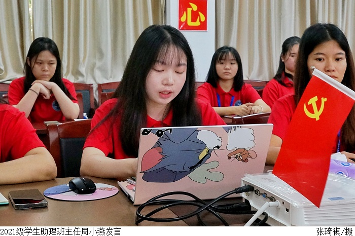叶玮俊代表2022级学生助理班主任发言表示,全体2021级学生助理班主任将进一步发挥引领作用,主动沟通协调,把握工作重点,在指导2022级新生成长的同时促进个人全面成才,为成为肩负民族复兴使命的时代新人而共同奋斗。