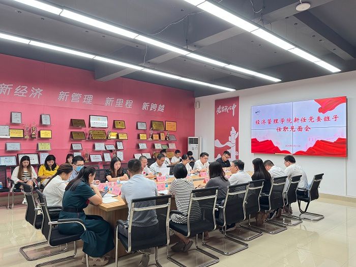 本网讯(经济管理学院 阮豪胜、谭欣颖)2025年7月11日,经济管理学院召开新任党委班子任职见面会。学校党委副书记张宗珊、原学院党委书记甘怀南(现智能制造学院党委书记)、新任学院党委副书记吕媛、魏甫龙、学院院长赵燕、副院长伦肇亮及各教研室主任、全体辅导员出席会议。会议由学院副院长黎传熙主持。