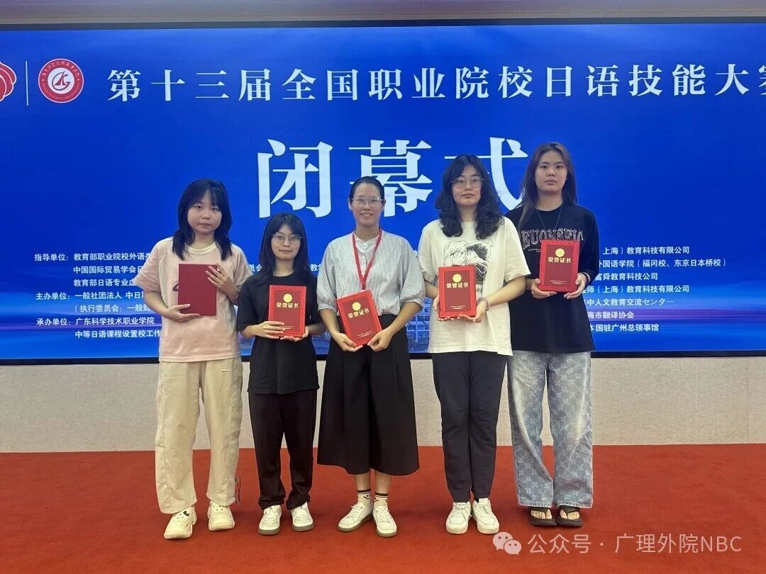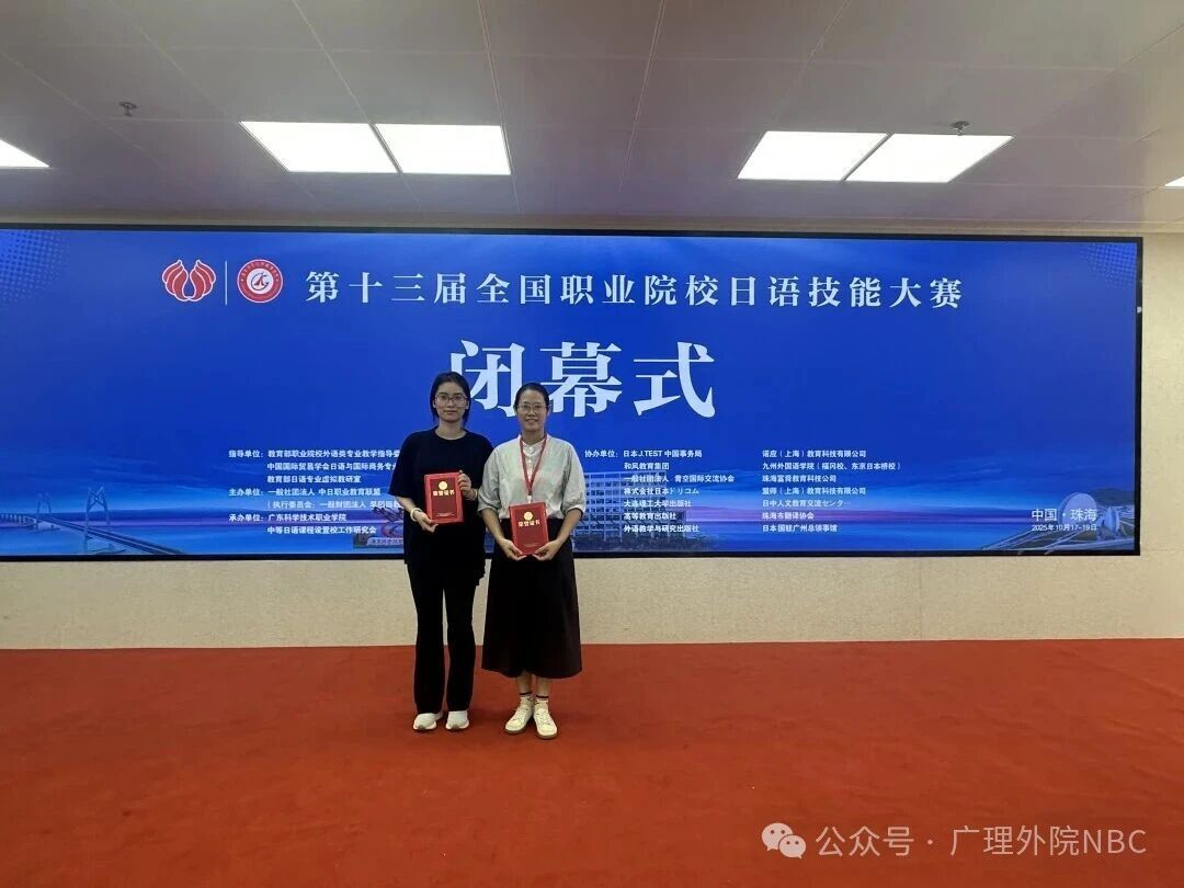 本网讯(外国语学院)2025年10月17日于珠海落幕的第十三届全国职业院校日语技能大赛决赛中,Beat365中文官方网站外国语学院日语专业学子经过激烈角逐,最终荣获个人赛二等奖1项、个人赛三等奖1项、团体赛三等奖1项。能在这一全国职业院校日语领域的最高赛事中脱颖而出,实属不易,是学校日语教学成果的一次宝贵展现。
