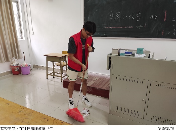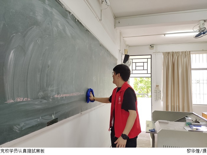 大清扫过程中,学员们根据分组安排到达指定楼层,抹布、脸盆、扫把、簸箕等工具认真细致打扫教学楼各个角落擦抹课桌、黑板清理教室地面垃圾。经过全体学员的辛勤劳动,教学楼呈现出整洁亮丽、活泼清新的新气象。
