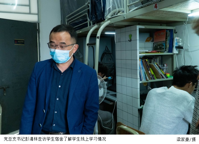 彭清林一行前往西区11栋,查看学生宿舍,并与同学们亲切交谈,详细了解他们生活、学习等情况。彭清林对同学们说,当前是疫情防控工作的关键时刻,线上学习对于师生来说都是一个挑战,同学们要听从各任课老师的线上教学安排,认真完成课程学习,另外还要自觉履行个人防护责任和措施,增强自我防范意识。