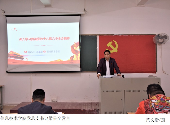 本网讯(信息技术学院 陈永炫)11月30日下午,信息技术学院振华楼519室召开学习贯彻党的十九届六中全会精神宣讲会。党总支书记梁星全主讲,全体师生党员参加