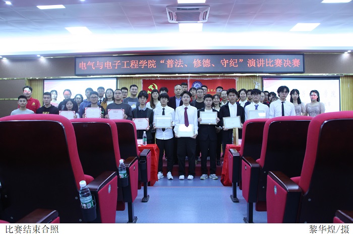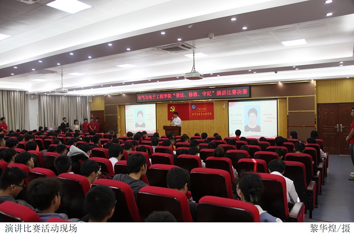 本网讯(电气与电子工程学院 叶运黎/黎华煌)为加强对新生的法制教育,创新普法形式,11月8日下午,电气与电子工程学院在42101举行“普法、修德、守纪”演讲比赛。