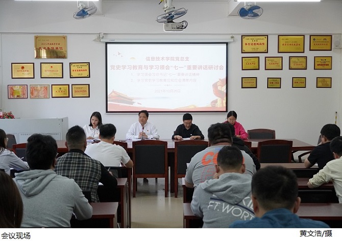 本网讯(信息技术学院 钟梓楹/王柳森)为进一步深入学习领会习近平总书记“七一”重要讲话精神,推动党史学习教育走深走实,10月26日,信息技术学院党总支于振华楼203室开展深入学习领会习近平总书记“七一”重要讲话研讨会。党总支书记梁星全主持会议。