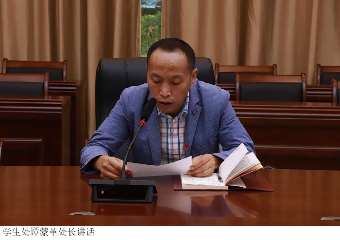 学生处处长谭蒙革分享了学习习近平总书记“七一”重要讲话精神学习体会。他表示,党员干部要深入学习习近平总书记“七一”重要讲话蕴含的六个亮点,将党史学习教育与自身工作结合起来,不断提高把握新发展阶段、贯彻新发展理念,构建新发展格局的政治能力、战略眼光、专业水平。