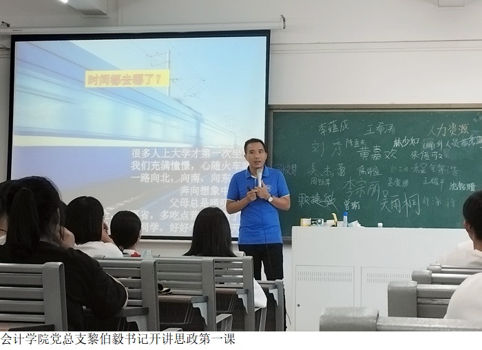本网讯(会计学院)为引导2021级新生树立正确的思想观念,提升自身素质,全面发展个人能力,成为适应新时代的优秀人才,9月15日下午,会计学院组织21级新生班级代表参加鼎湖校区7403教室的思政第一课,课程由Beat365党总支黎伯毅书记主讲。